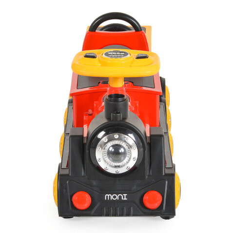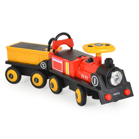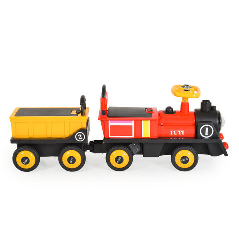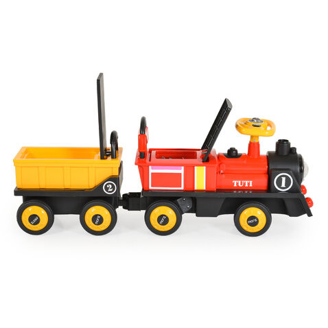 Двуместният акумулаторен влак Tuti е подходящ за деца от 3 до 8 години с максимално тегло до 50 кг. Работи с 12V 4.5Ah батерия, осигуряваща до 60 минути забавление. Лесното управление чрез кормило с бутони за движение напред/назад и завиване прави играта безопасна и интерактивна. Локомотивът и вагонът могат да се отделят, а светлинните ефекти, мигащите фарове и музикалният плеър с USB вход добавят образователен елемент. Дюзата за пара и реалистичните звукови ефекти правят преживяването още по-ангажиращо. Ергономичната седалка с ръкохватка и включения вагон осигуряват комфорт и ролеви игри. Подходящ за равни и сухи повърхности, сертифициран по стандарти EN 71 и EN IEC 62115. Превърнете игрите на открито в безопасно и забавно приключение с влак Tuti!