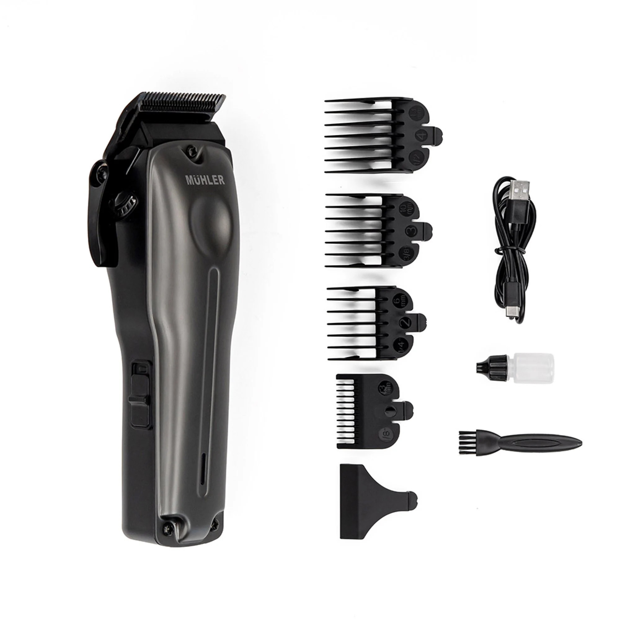 Акумулаторна машинка за подстригване Muhler MCL-05P, 5W, с USB-C зарядно, идеална за домашна и професионална употреба. Ергономичен дизайн, тихо функциониране и минимални вибрации. Регулируеми ножове 3/6/9/12 мм от неръждаема стомана с лесно свалящо се острие за почистване и защитно капаче. В комплекта са приставка за подстригване, смазочно масло и четка. Лесно включване с бутон Вкл./Изкл. и бързо зареждане чрез USB-C кабел. Подходяща за всички типове коса, осигурява прецизни резултати и удобство при поддръжка на външния вид.