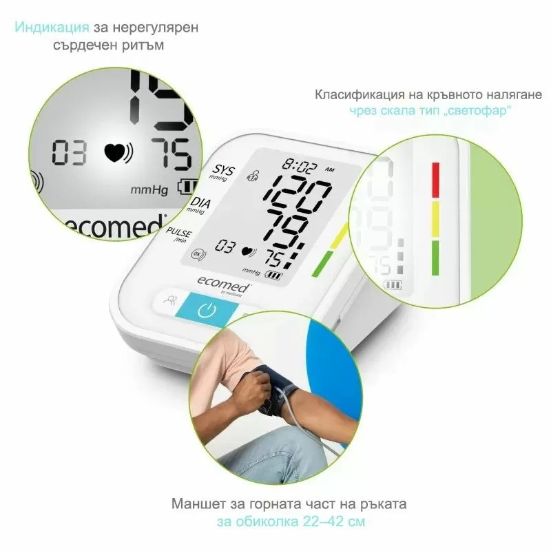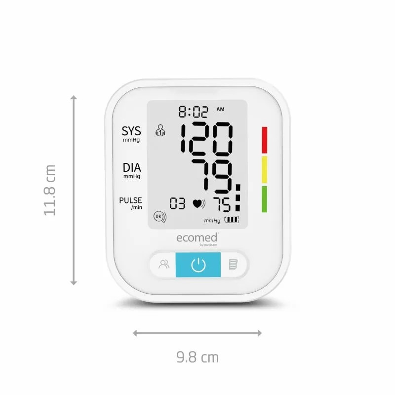 Апаратът за измерване на кръвно налягане Ecomed BU 95E на Medisana AG, Германия е надеждно и напълно автоматично решение за домашна употреба. Предназначен е за измерване над лакътя и разполага с голям маншет 22–42 см, подходящ за различни обиколки на ръката. Уредът използва осцилометричен метод и осигурява точни резултати за систолично и диастолично налягане, пулс, дата и час.