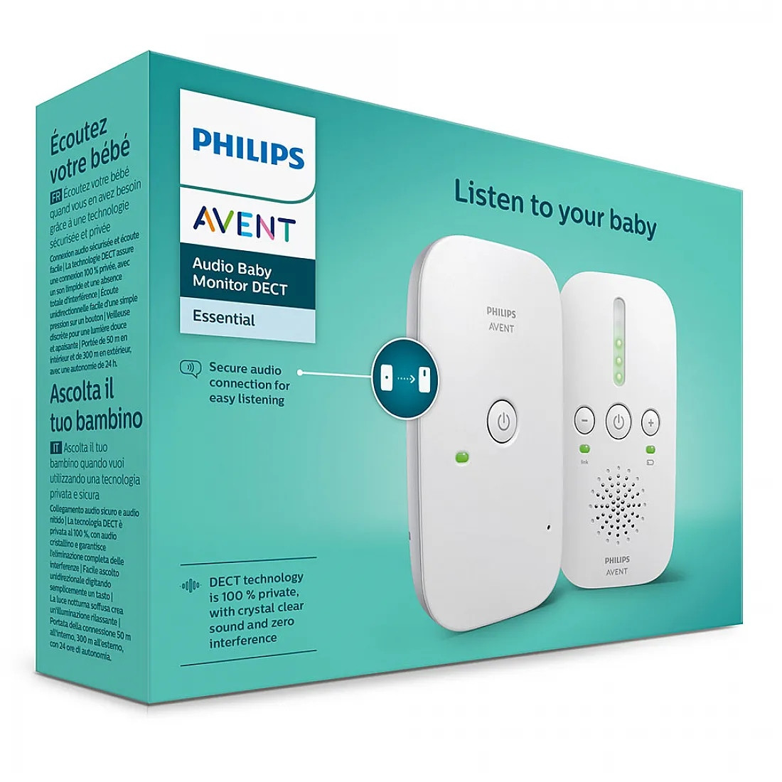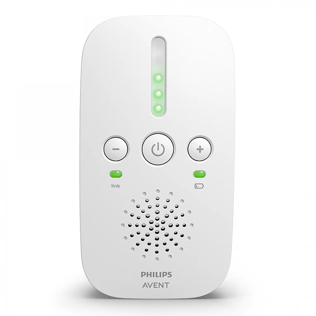Бебефонът Philips AVENT DECT SCD502/26 осигурява надеждна връзка и кристално чист звук благодарение на DECT технологията, която елиминира смущенията. Родителското устройство работи на ток или с две АА батерии, а SMART ECO режимът удължава живота на батерията. LED индикаторите показват ниво на звука, състояние на връзката и предупреждение при „извън обхват“. Вградената нощна светлина създава спокойна атмосфера за сън. Бебефонът предлага автоматичен избор на канали, регулиране на звука и работа до 24 часа, осигурявайки надеждна комуникация с бебето.