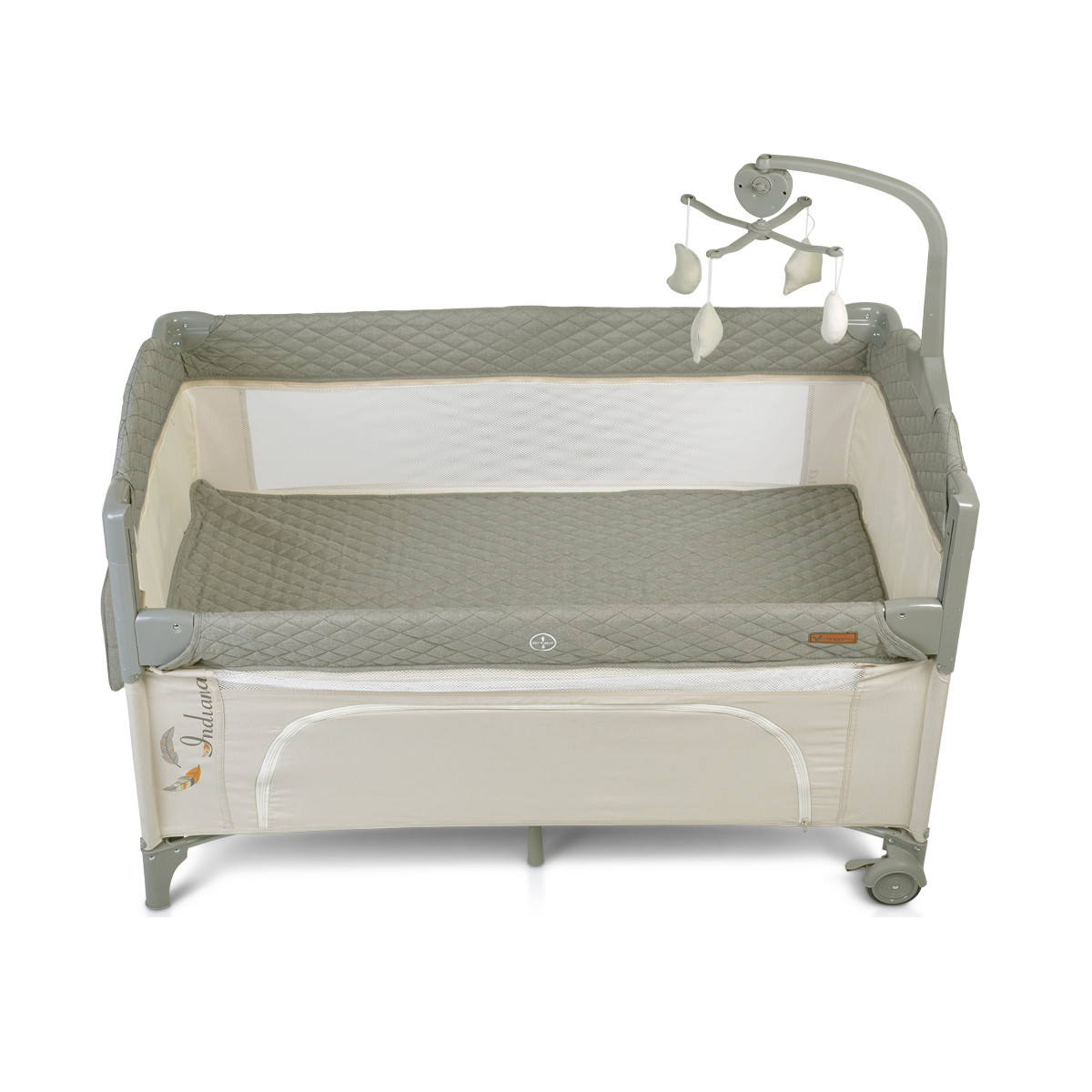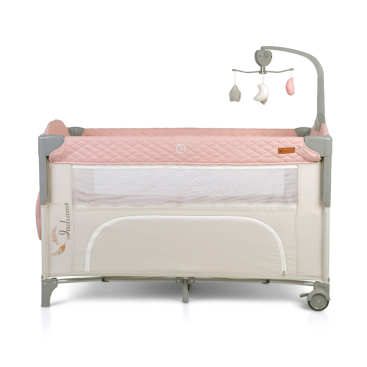 Бебешка кошара Cangaroo Indiana е проектирана на две нива като първото е подходящо за деца от 0 до 6 месеца, а второ – за малчугани от 6 до 36 месеца. Тя е удобна и практична, със сваляща се преграда, за да е по-лесен достъпа. Мрежестата част от двете страни ви позволява да наблюдавате детето и осигурява добър въздушен поток. Изработена е с голям органайзер с цип, в който може да съхранявате нужните на бебчето аксесоари и багаж. За комфорта и забавлението се грижи музикалният гриф с играчки. В кошарата вашето дете ще има пълноценен сън и весели игри. Тя се сгъва до компактни размери, като има и двойно ocигypитeлнa cиcтeмa зa cгъвaнe.