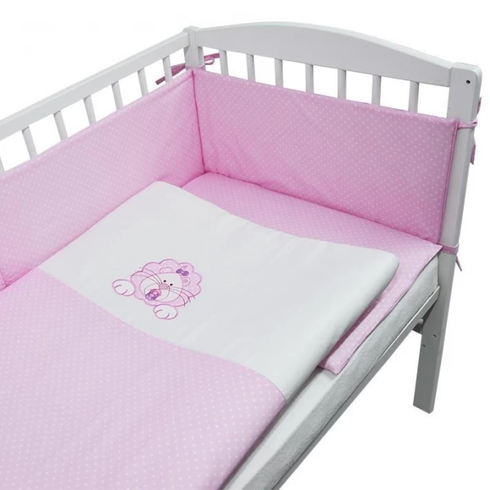 Бебешки спален комплект от 3 части EKO - Poland Лъвче е подходящ за креватче или кошара. Той не дразни кожата, позволява й да диша, нежен е към нея и е много лесен за поддръжка. Този бебешки спален комплект е произведен от 100 памук, а обиколникът съдържа силиконови фибри, които не предизвикват алергии и дразнене на кожата. Обиколниците са много полезни аксесоари, които предпазват бебето от нараняване. Докато се усъвършенства или поне подобри координацията на крайниците и тялото, рискът да се удари в таблите и решетката на бебешкото легло е доста голяма. Комплектът е от 3 части в различни цветове.