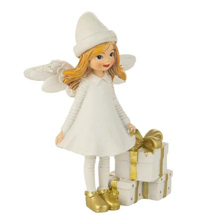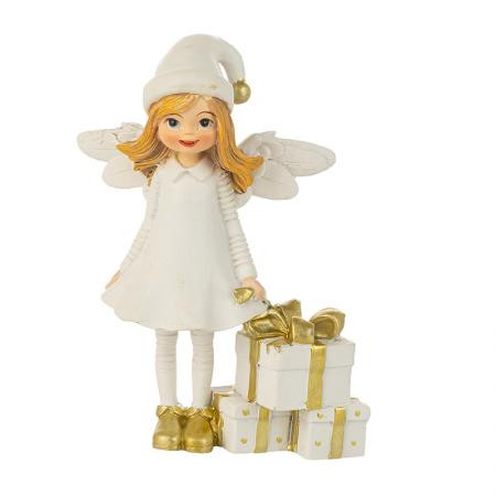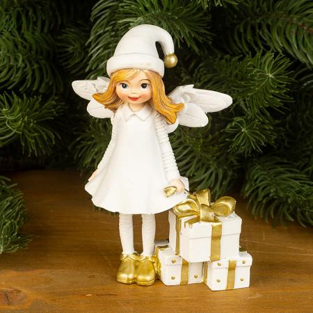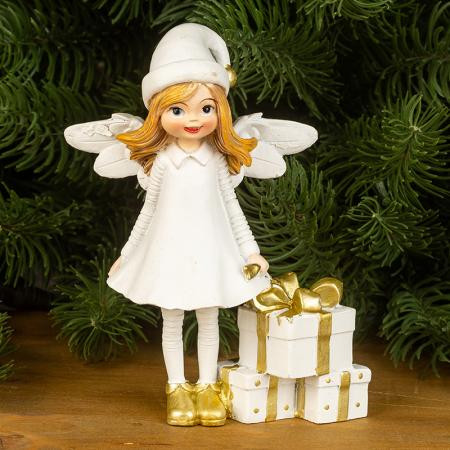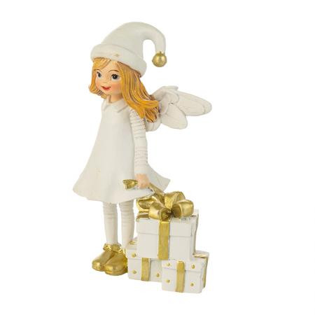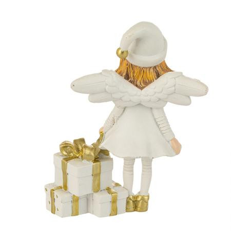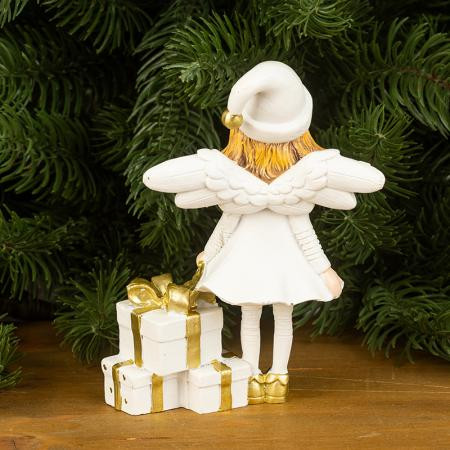 Добавете празничен чар с тази коледна фигурка на бял ангел с подаръци. Усмихнатото ангелче в снежнобяла рокля и златни обувки носи топлина, уют и празнична магия. Държи красиво опаковани златно-бели подаръци, символ на щедрост и доброта, които създават настроение за Коледа. Фигурката е изработена от здрав полирезин и впечатлява с деликатни детайли. Идеална за декорация на дома, офиса или като подарък за близки.