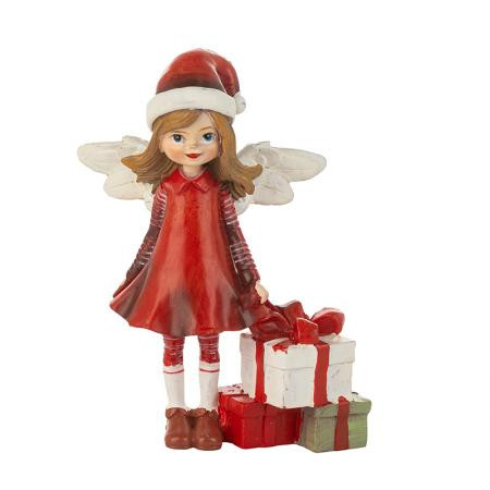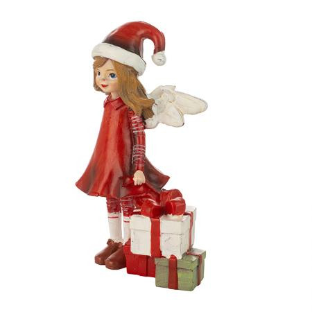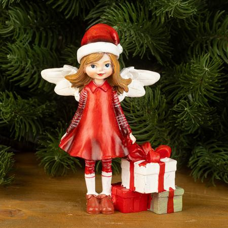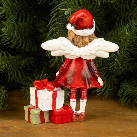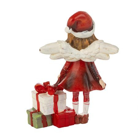 Добавете празничен чар с тази коледна фигурка на ангел в червена рокля и коледна шапка, носещ красиво опаковани подаръци. С нежно лице, деликатни крилца и златисти акценти, тя създава топло и весело настроение. Изработена от качествен полирезин, фигурката е стабилна и детайлна, подходяща за маса, рафт, камина или около коледното дърво. Перфектен подарък за близки, които обичат празничната атмосфера.
