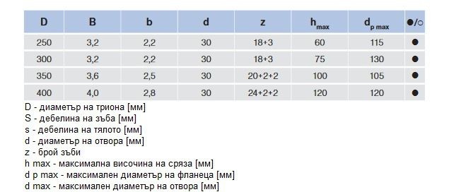 - D - диаметър на триона: 250 - 400 мм