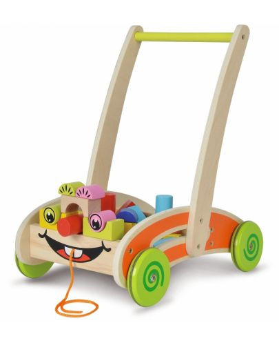 Детска дървена количка за бутан с блокчета Eichhorn 35 части е изработена от дърво. Освен проходилка, тя се превръща в играчка за дърпане, когато дръжката се отстрани. В дървената количка ще откриете различни фигурки в различни цветове, които вашето мъниче може да подрежда. Чрез тях то ще се запознае с цветовете и формите, като общият им брой е 35. Колелцата на проходилката са изработени с гумени ленти за по-удобно и безшумно бутан или дърпане. Тя е подходяща за деца над 6 месеца още при първите им стъпки.