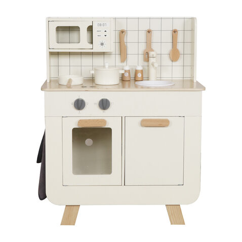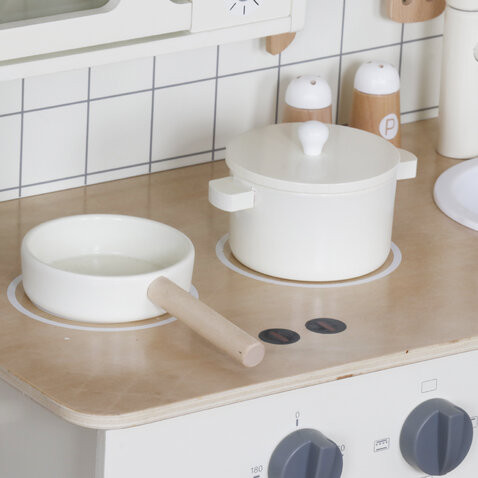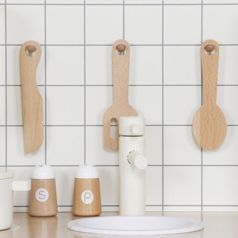Тази красива детска кухня е изработена от висококачествено, устойчиво дърво и боядисана с безопасни, нетоксични бои. Включва 9 дървени кухненски аксесоара и реалистични детайли като отварящи се шкафчета. Подходяща за деца над 3 години.