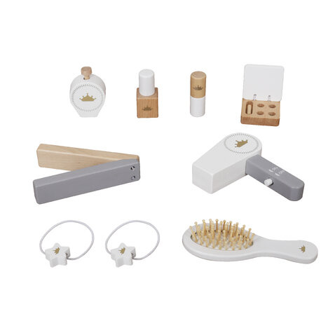 Очарователна детска тоалетка с огледало, създадена специално за малки принцеси. Комплектът включва 9 дървени аксесоара за разкрасяване, които стимулират въображението и ролевата игра. Подходяща е за деца над 3 години и е изработена от висококачествени, безопасни материали.
