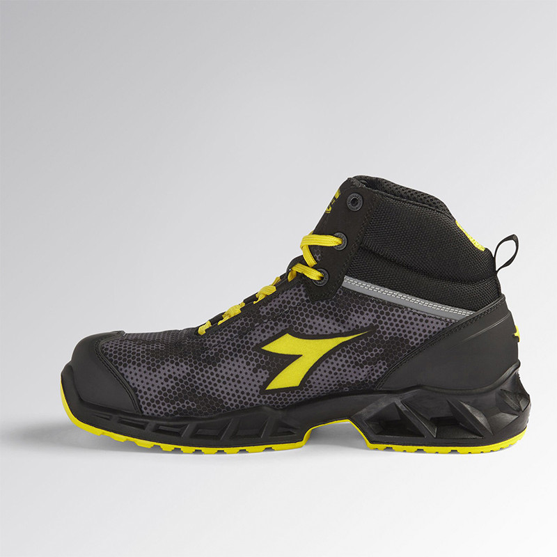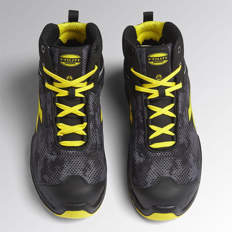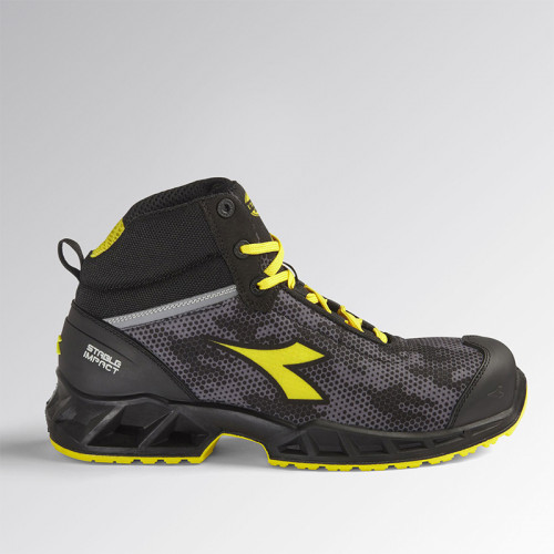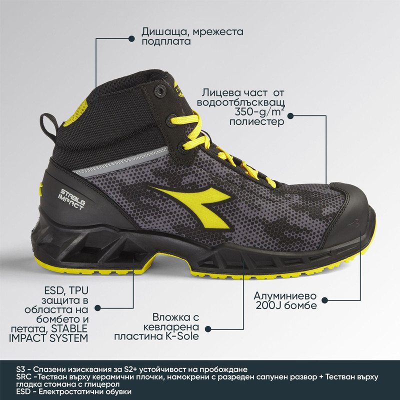Diadora SHARK STABLE IMPACT Mid S3 са високи работни обувки с алуминиево бомбе (200J) и кевларена вложка K-Sole. Изработени от водоотблъскващ 350 g/m² полиестер, с дишаща мрежеста подплата и полиуретаново ходило за комфорт и устойчивост. Обувките предлагат ESD защита, TPU подсилване на бомбето и петата, както и STABLE IMPACT система за максимална стабилност. Отговарят на стандарт EN ISO 20345:2011 – идеални за професионална употреба в индустрията и строителството.