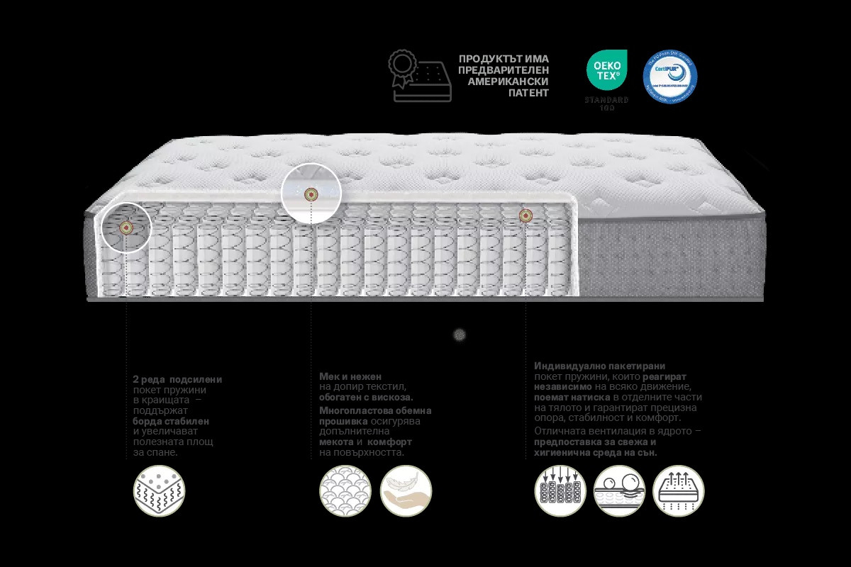Изработен в България и тестван според европейските стандарти за качество (EN/DIN 1957), този модел съчетава издръжливост и устойчивост. Калъфът е от вискозен плат, който не задържа топлина и абсорбира влагата. Добавената мека полиуретанова пяна и 100% полиестерна вата осигуряват допълнителен комфорт.