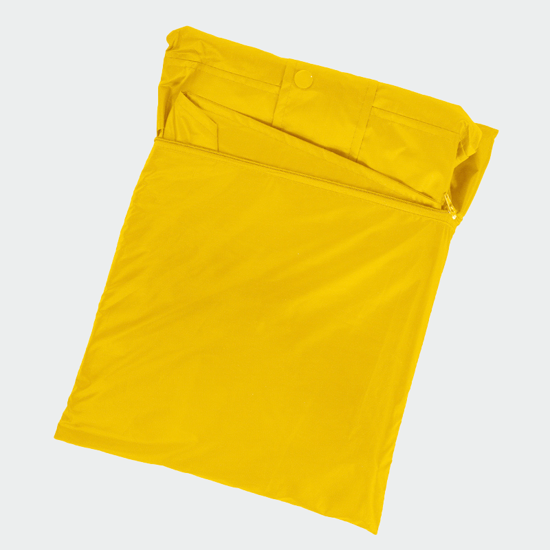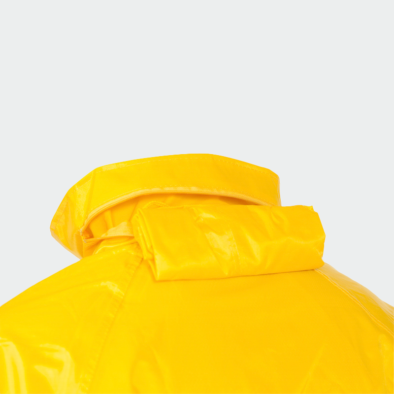 Дъждобран Poseidon жълт е с прибираща се качулка, ластици на ръкавите и двойно закопчаване с цип и пластрон с тик-так копчета. Има отвори за проветрение и е в комплект с практичен полиестерен калъф. Предлага се с размери от S до 3XL.