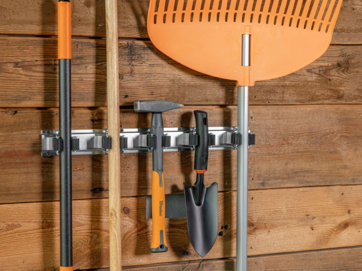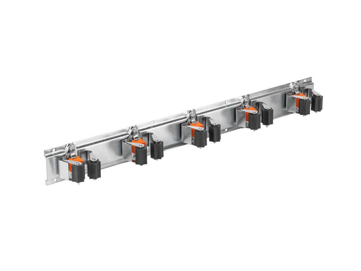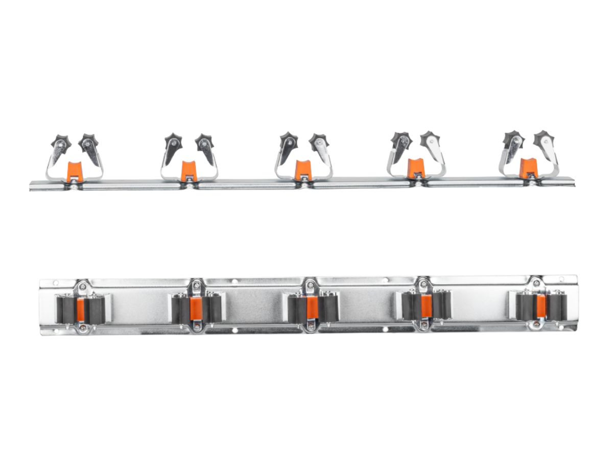 Държачи за инструменти на шина 50 см – комплект от 5 броя, идеално решение за организиране на гараж, работилница или склад. Изработени от здрава стоманена шина и ролкови държачи от въглеродна стомана и TPR материал, тези държачи осигуряват надеждно захващане на инструменти с диаметър от 20 до 35 мм. Перфектни за метли, мопове, гребла, лопати и различни градински инструменти.