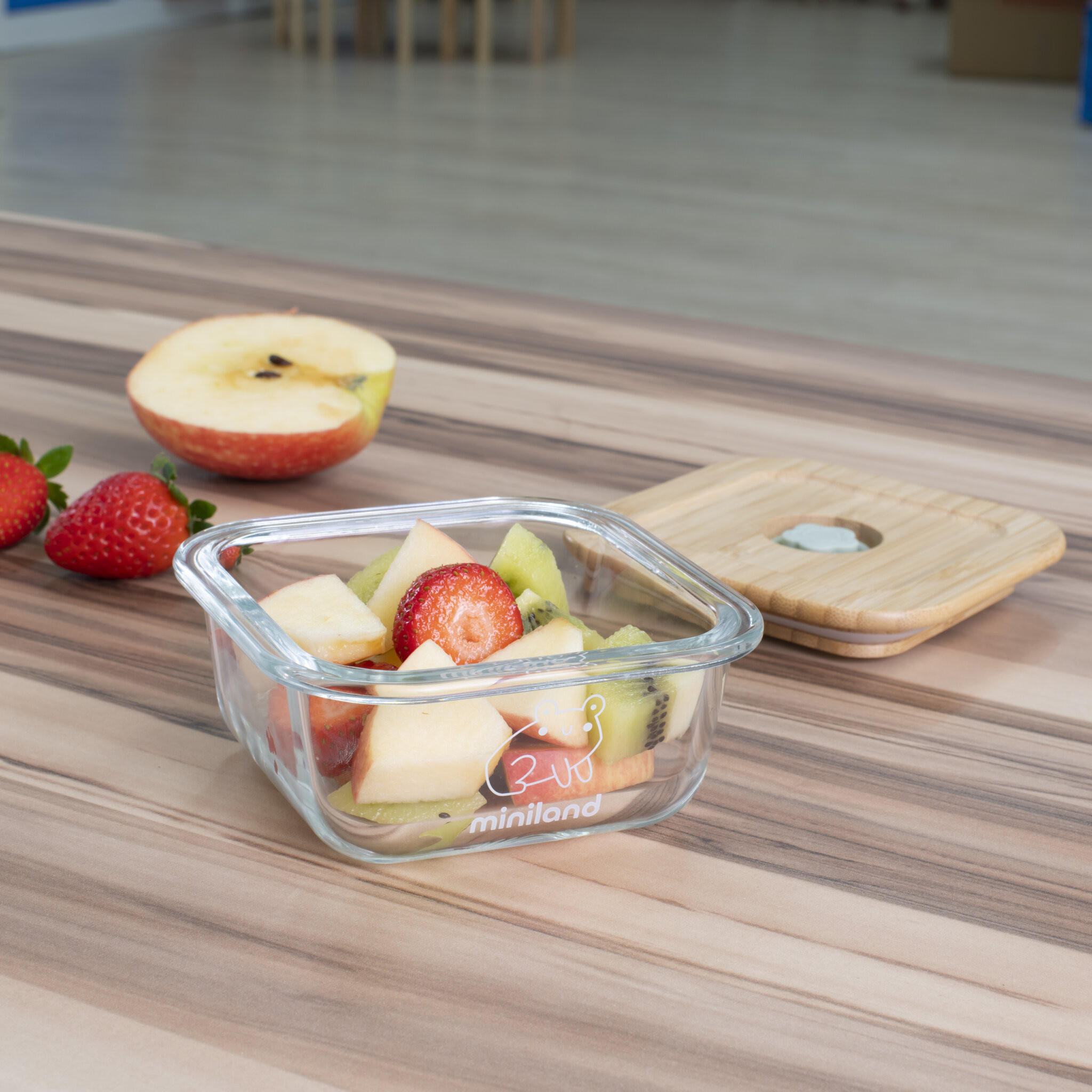 Miniland Eco стъклени контейнери 2×210 мл – птичка са практично и екологично решение за съхранение на храна. Комплектът включва два прозрачни контейнера от устойчиво стъкло по 210 мл, с бамбуков капак от FSC™ сертифицирани гори. Херметичният клапан и силиконовото уплътнение запазват свежестта и ароматите без разливане. Подходящи са за съдомиялна машина, фризер, микровълнова и фурна. Лесни за почистване, безопасни и хигиенични – идеални за ежедневна употреба.