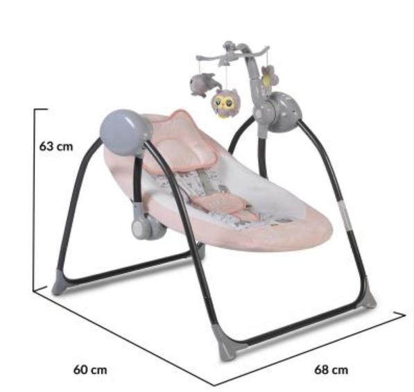 Електрическа люлка Moni Zazu е подходяща за деца на възраст приблизително до 6 месеца и с максимално тегло до 9 кг. ZaZu има 5-степени на люлеене, които са обозначени със светещи индикатори. Люлката има 3 настройки на времетраенето на люлеене - 8, 15 и 30 минути. Детската люлка има 12 нежни мелодии с 4 акорда и контрол на звука. Седалката има две позиции на гръбчето - легнала за почивка и полуизправена за игра. Детската люлка работи с адаптер или с 4бр. АА батерии. Към комплекта е включен гриф с 3 забавни играчки (бухал, рибка, цвете) за визуална стимулация на бебето. Люлката се сгъва лесно и компактно за улеснено прибиране и съхранение.