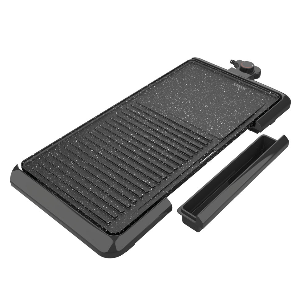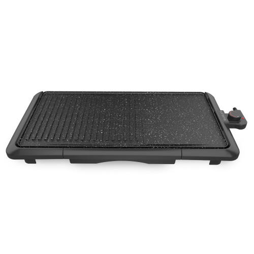 Електрическата скара Muhler MG-5126 е идеален избор за лесно и бързо приготвяне на храна вкъщи. Плотът е изработен от висококачествен лят алуминий с размер 25x51 см, като половината е оребрена за класическо готвене на скара, а другата половина е гладка за пържене. Специалното мраморно незалепващо покритие осигурява равномерно разпределение на топлината и предотвратява залепването на храната.