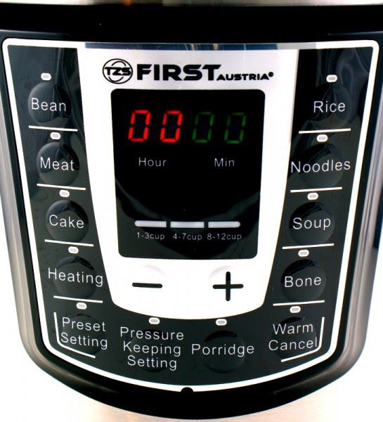 Електрическа тенджера под налягане First FA-5130 1000 W е с модерен дизайн, с 8 нива на защита и капацитет 6 литра.Температурата и налягането се контролират автоматично от вграден компютър. Електрическата тенджера под налягане е подходяща за приготвяне на различни варианти, месо, кейк, спагети, супи и много други. Уредът Ви дава възможност да постигнете енергоспестяване до 60% и спестяване на време до 40%. Електрическа тенджера под налягане First FA-5130 1000 W е многофункционална и замества много от кухненските уреди, като обикновените тенджери под налягане, уредите за приготвяне на ориз, обикновените тенджери за готвене и др.