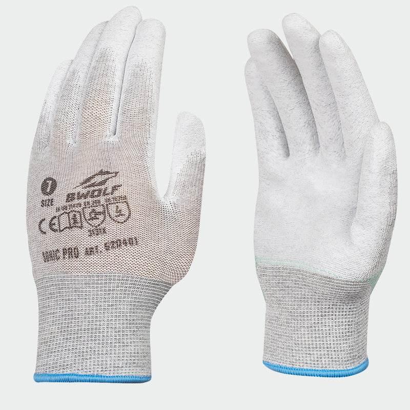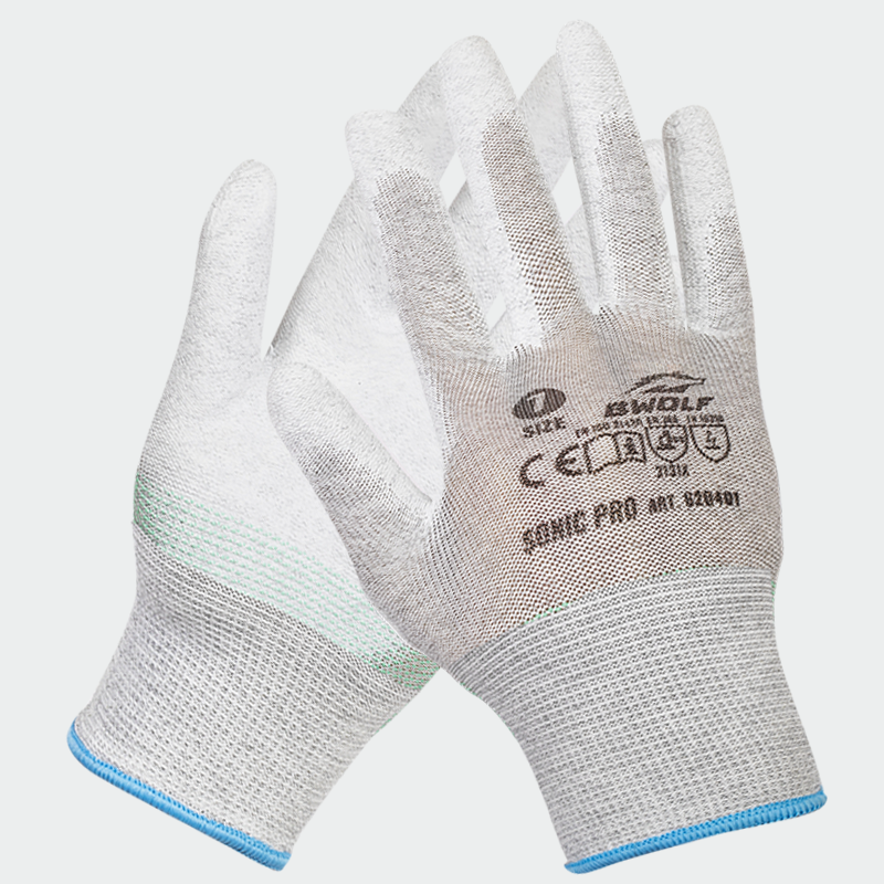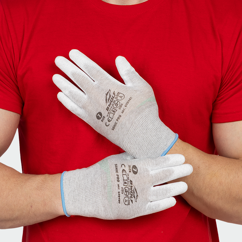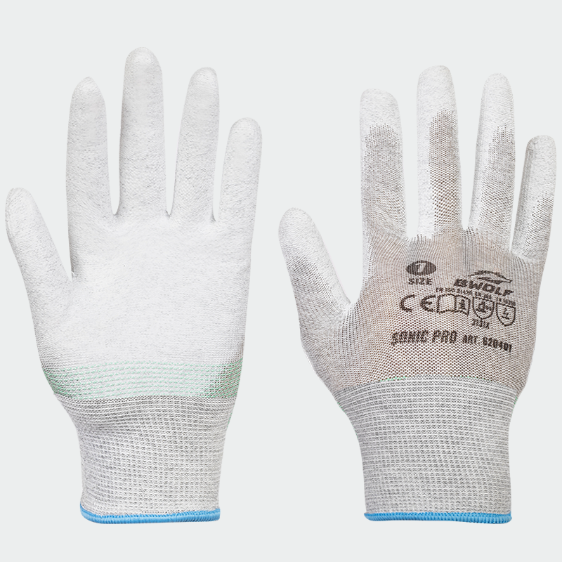 Работните ръкавици SONIC Pro BWOLF са безшевни, антистатични (ESD) и изработени от полиестерно трико с карбонова нишка. Благодарение на полиуретановото покритие на дланта, те осигуряват отличен захват, гъвкавост и защита от механични наранявания. Дишащата материя предотвратява запарване, а еластичният маншет осигурява стабилно прилягане. Ръкавиците са подходящи за професионална употреба в среди с електростатичен риск. Предлагат се в опаковка от 12 чифта.