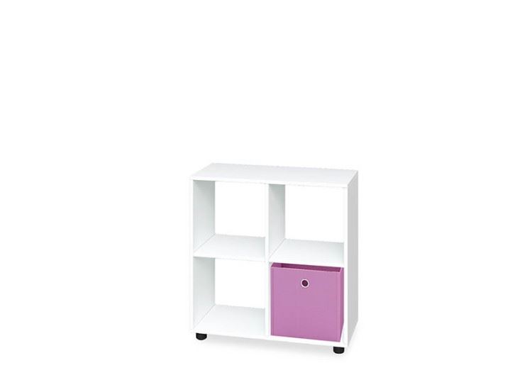 Етажерка Кубо 4 бяла е с размери 68 х 72 х 33 см и разполага с 4 широки рафта. Изработена е от ПДЧ 16 мм с кант 0,5 мм в цвят ГБ бяло гладко. Кутията, показана на снимката, се предлага отделно. Към етажерката се предлагат и вратички в цвят Кроношпан бетон светъл 4298.