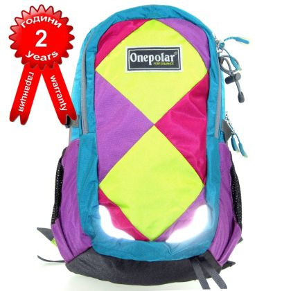 Градска раница ONE POLAR в зелено с лилаво и розово, подходяща за училище и ежедневие. Моделът разполага с анатомичен гръб и анатомични презрамки с мрежа за максимален комфорт. Изработена е с висококачествени YKK ципове, здрави катарами и водоустойчиво покривало против дъжд. Раницата има една основна камера, два предни джоба с преграда и ключодържател, както и два странични мрежести джоба за бутилка. Вместимост 20L и 2 години гаранция. Включен подарък: ученически пособия.