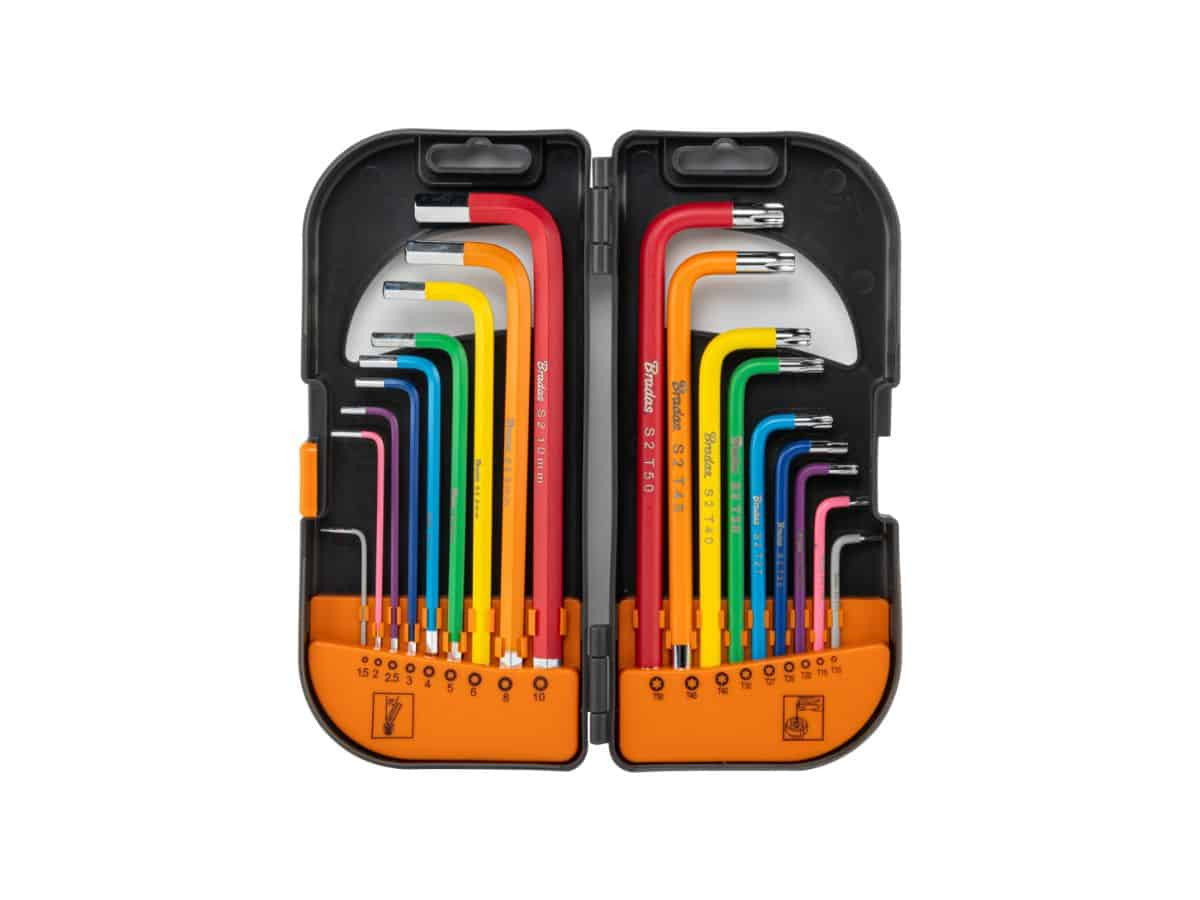 Комплект Г-образни дълги ключове Bradas – 18 части с имбусни и Torx ключове. Включва 9 имбусни (шестограми) и 9 Torx (звездограми) ключа, всеки с цветно покритие за лесна идентификация. Дългата Г-образна форма осигурява достъп до труднодостъпни места, а сферичният връх на имбус ключовете позволява работа под ъгъл до 25°. Изработени от висококачествена S2 стомана, ключовете са здрави и устойчиви на износване. Цветният код улеснява бърз избор на точния размер, което повишава ефективността при работа. Този комплект е идеален за монтаж, поддръжка и ремонт на велосипеди, мебели, машини и електроника. Надежден и удобен инструмент за професионалисти и домашни майстори.