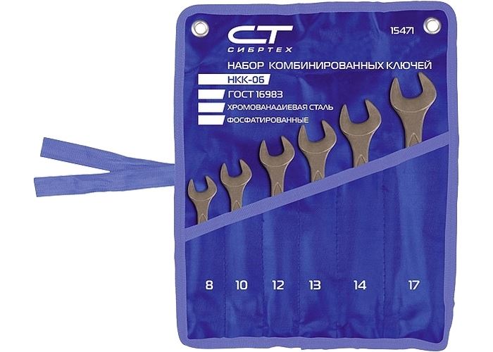 Комплект ключове звездогаечни 6 - 22 мм 8 - 12 бр ГОСТ 16983 СИБРТЕХ са изработени от CrV сплав с твърдост 42 - 47 HRс, горещо пресовани, с допълнителна термична закалка. Имат черно фосфатно покритие, предпазващо от корозия. Предлагат се в комплект по 8 и 12 броя с размери от 8 до 22 мм.