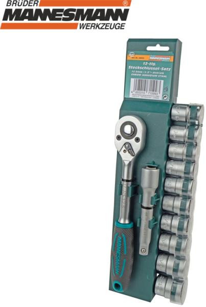 Комплект професионална тресчотки и вложки MANNESMANN 12 части е изработена от хром-ванадиева стомана. Разполага с двукомпонентна ръкохватка 1/2", ляв и десен ход.