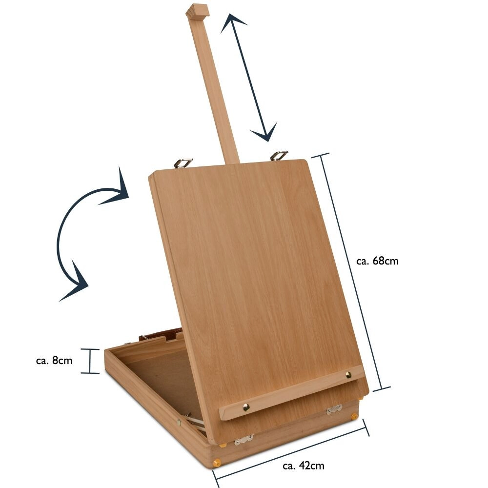 Kомплект за рисуване Винсент 188 части Artina съдържа всичко необходимо. Независимо дали искате да рисувате с цветни моливи, акрилни бои, акварелни бои, маслени пастели, въглен или просто с моливи, всичко е включено в този комплект за рисуване. В Комплектът е включен настолен статив за рисуване, който също може оптимално да се използва като куфар за пренасяне на всичко включене в комплекта, който е еднакво подходящ както за начинаещи, така и за художници любители. Стативът е изработен от масивна букова дървесина, напълно сглобен и може да се използва веднага. Четирите гумени крачета гарантират сигурна и нехлъзгаща се основа на статива. Kомплект за рисуване Винсент 188 части може лесно да транспортира.