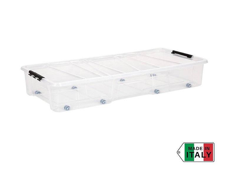 Кутията за съхранение Dea Home 35 л с колелца е практично решение за подреден и организиран дом. Прозрачният корпус позволява лесен преглед на съдържанието и улеснява ежедневната употреба. Подходяща е за съхранение на дрехи, спално бельо, кърпи, детски играчки и аксесоари. Компактният дизайн я прави идеална за използване под легло или ниски мебели. Вградените колелца осигуряват удобно преместване, а капакът с клипс-закопчаване предпазва вещите от прах и замърсяване. Отличен избор за функционално домашно съхранение.