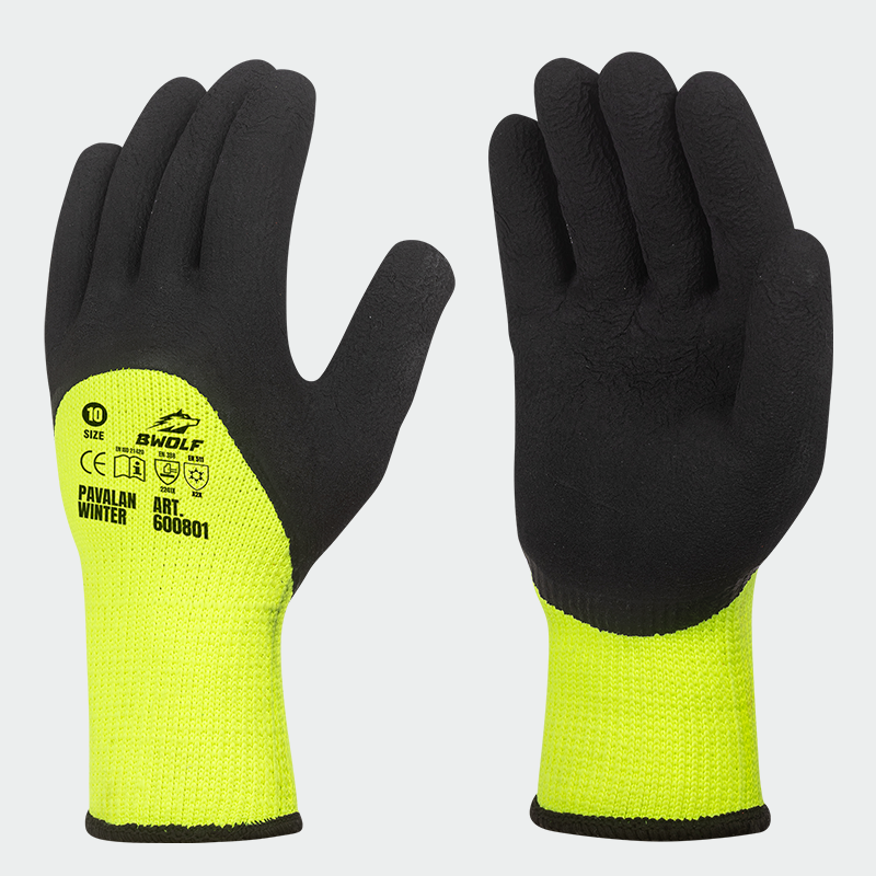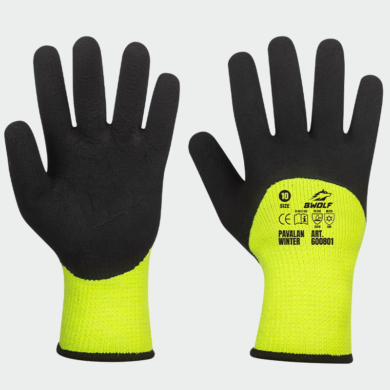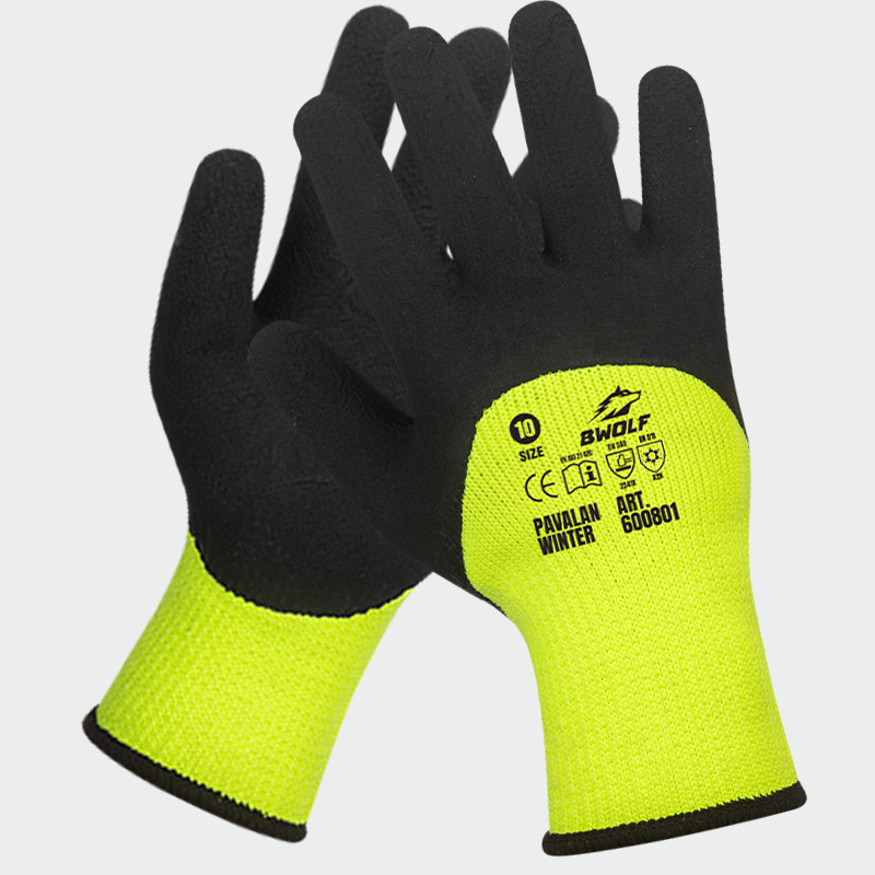 Зимни работни ръкавици PAVALAN Winter с издръжлива полиестерна подплата, осигуряваща отлична топлоизолация и защита срещу студа. 3/4 потопени в латексова пяна, те предлагат сигурно сцепление, водоустойчивост и гъвкавост при работа на открито. Ергономичният дизайн гарантира плътно прилягане, комфорт и безопасност дори в екстремни условия. Подходящи за строителство, градинарство и други външни дейности. Изработени от полиестер (ПЕ), налични в размери 10-11. Сертифицирани според стандартите EN 388 и EN 21420.