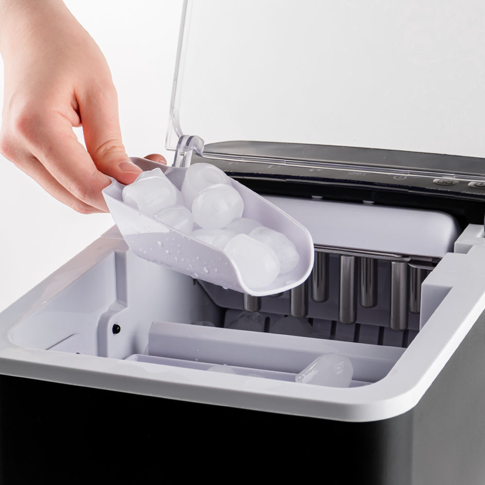 Размерите му са компактни – 270×222×290 мм, а захранващият кабел е дълъг 1.5 м. В комплекта са включени кошница и лопатка за лед. Мощност: 150W, захранване: 220-240V/50-60Hz. Отличен избор за дом или заведение, нуждаещи се от бърз и надежден ледогенератор.