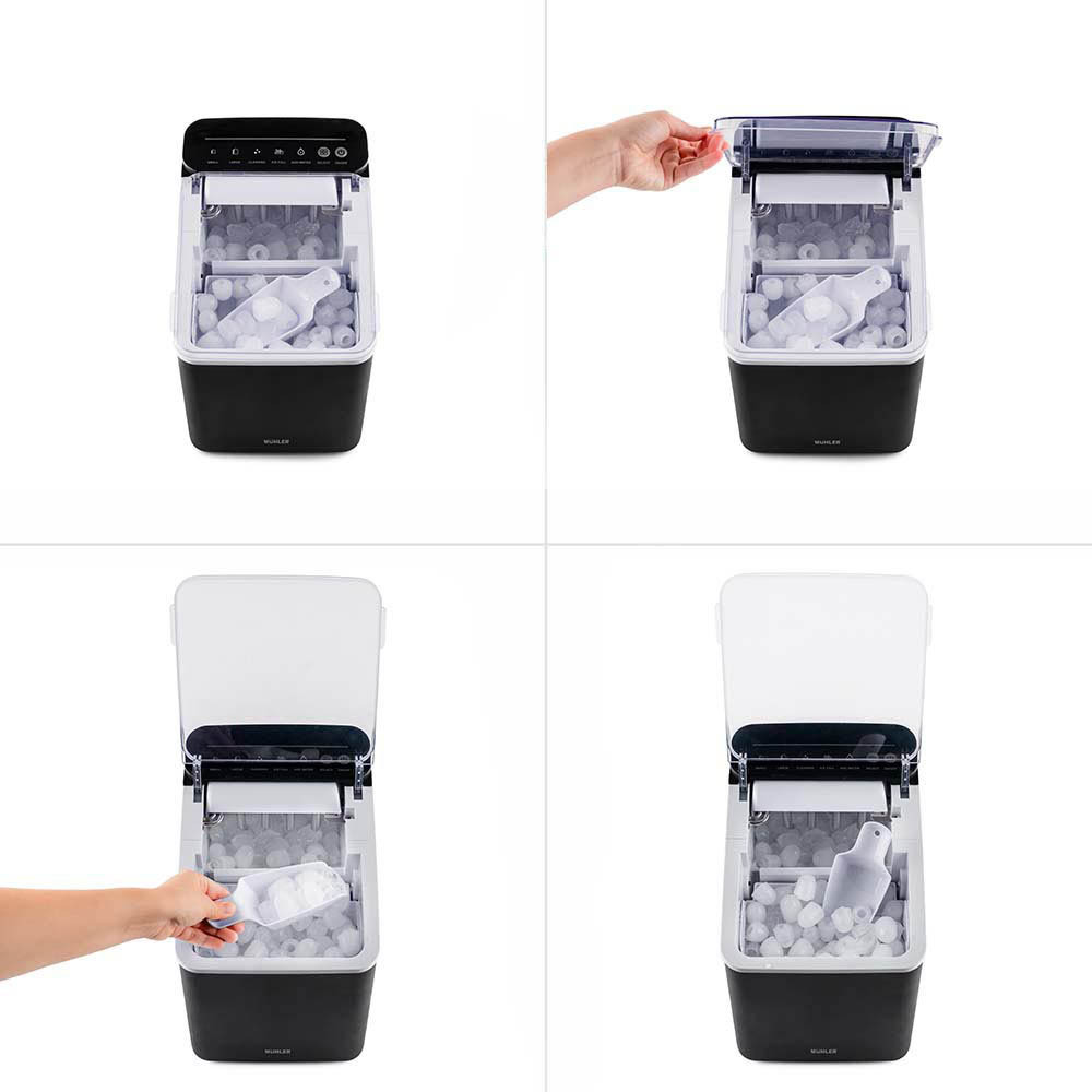 Удобният LED контролен панел позволява лесно управление и наблюдение на работата. Оборудван с ревизионен прозорец, устройството предупреждава при пълен контейнер за лед и празен резервоар за вода, което гарантира безпроблемна работа. Функцията за самопочистване поддържа хигиената на машината.