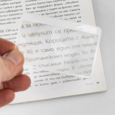 Лупата карта AA853B е практичен и компактен аксесоар с 3-кратно увеличение, идеален за четене на дребен шрифт у дома, в офиса или при пътуване. Моделът разполага с тънък дизайн с размери 85×53×0.4 мм и качествена оптична леща с пластмасова рамка. Включеният калъф в черен цвят с бяло лого Silver Flame предпазва лупата и осигурява стилен външен вид. Този практичен инструмент е удобен за ежедневно използване и лесно се побира в портфейл или джоб.