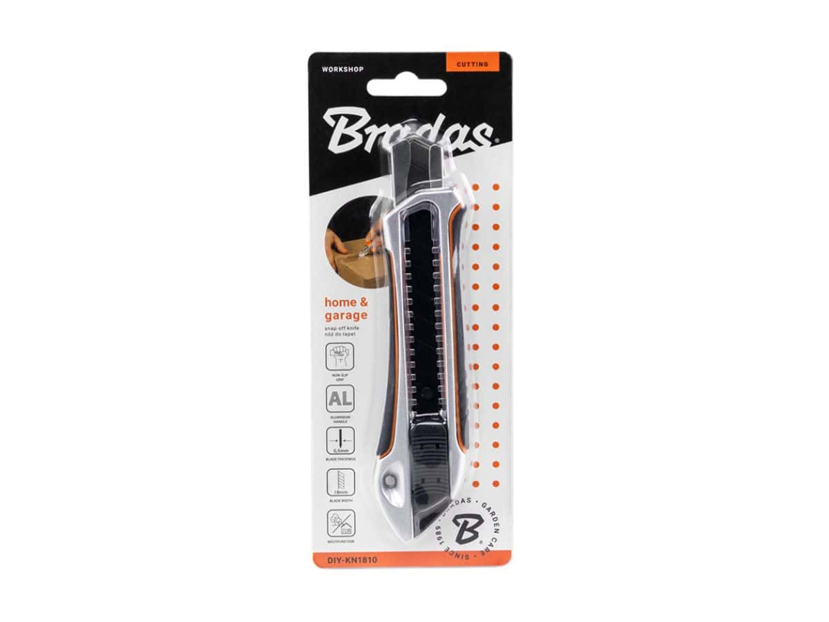 Макетен нож с алуминиев корпус и гумирано покритие, идеален за прецизно рязане. Острието с ширина 18 мм и дебелина 0,5 мм е изработено от висококачествена стомана, осигуряващо гладко и ефективно рязане. Ножът разполага със самозаключващ се плъзгащ механизъм (click-stop), който гарантира сигурност и удобство при работа. Ергономичният алуминиев корпус е покрит с TPR материал, осигуряващ стабилен и комфортен захват дори при продължителна употреба. Макетният нож позволява лесна смяна на остриета, което го прави дълготраен и практичен инструмент. Подходящ е за рязане на различни материали като картон, кабели, тапети, ленти и килими. Този нож е отличен избор за професионалисти и любители, които търсят надеждност и прецизност в инструментите си.