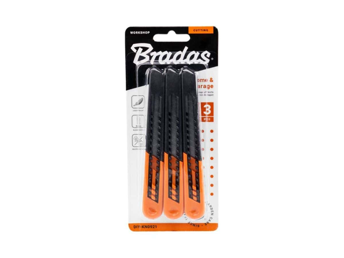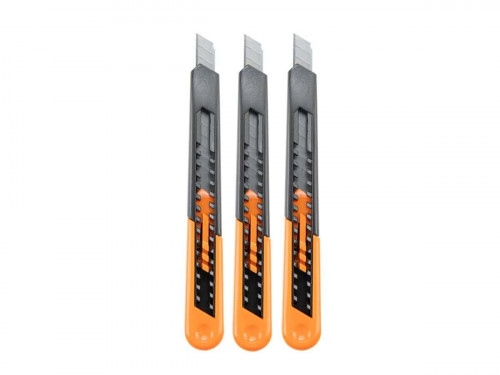 Комплект от 3 макетни ножа с острие 9 мм – идеален за прецизно рязане на картон, тапети, кабели, ленти и други материали. Всеки нож разполага със здрава стоманена вложка и самозаключващ се механизъм тип click-stop за безопасна и удобна работа. Леки и лесни за употреба, с възможност за смяна на острието. Перфектен избор за дома, офиса или професионална употреба.