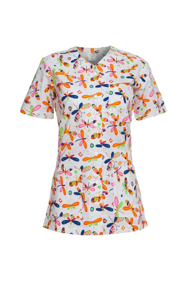 Медицинска дамска туника с копчета Carina кончета е изработена от лека и приятна материя със състав 50 % памук / 50 % полиестер, с плътност 140 гр / м2. Моделът е с къс ръкав и остро деколте, закопчава се с тик-так копчета, има три джоба и цепки. Предлага се с размери от XS до 3XL.