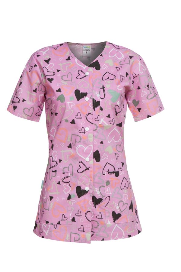 Медицинска дамска туника с копчета Carina розови сърца е с удобна кройка и весели мотиви.