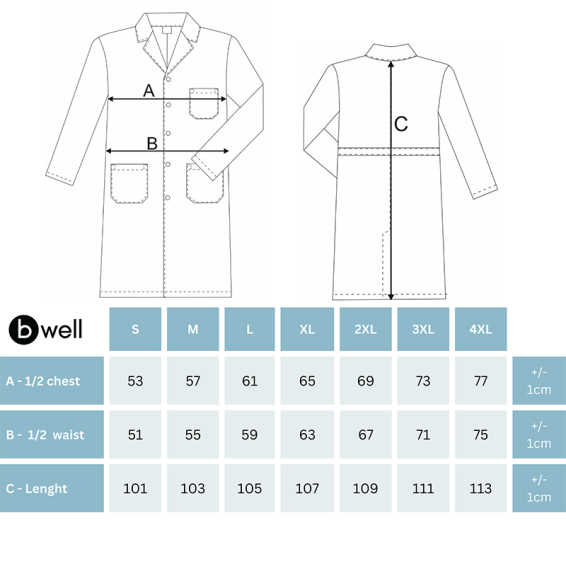 Медицинската престилка FABIO е мъжка работна манта с класически дизайн, подходяща за пролетно-есенния сезон. Изработена е от здрава и мека материя – 65% полиестер и 35% памук (160 г/м²), устойчива на пране при 60°C. Престилката разполага с класическа яка, дълъг ръкав, закопчаване с копчета, колан и три практични джоба – един горен и два долни. Дължината е до коляното. Идеална за медицински персонал и служители в сферата на обслужването. Комфорт, функционалност и професионален външен вид с FABIO.