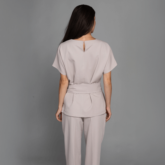 Медицинска туника SOFIA от Bwell Atelier в елегантен бежов цвят комбинира комфорт, стил и функционалност. Изработена от мека и устойчива материя (75% полиестер, 20% вискоза, 5% еластан, плътност 185 г/м²), туниката е лека, еластична и лесна за поддръжка. Свободната кройка с къс ръкав тип кимоно и вграден колан подчертават талията, а два скрити джоба в страничните шевове осигуряват удобство. Закопчаването с копче на гърба завършва елегантната визия. Идеален избор за медицински, стоматологични и уелнес специалисти, които търсят практичност и стил в ежедневната си работа.