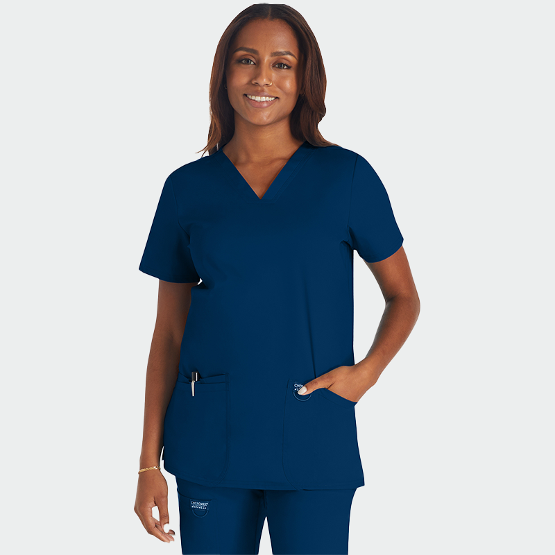 Медицинска туника Cherokee REVOLUTION WWE620 е модерна дамска туника с втален силует и остро деколте, изработена от висококачествена смес – 78% полиестер, 20% вискоза и 2% еластан (170 г/м²). Разполага с къс ръкав, два предни джоба – единият с отделение за химикалка и халка за бадж. Меката и дишаща материя осигурява комфорт и е подходяща за лекари, медицински сестри, зъболекари, фармацевти, ветеринари и студенти. Предлага се в няколко модерни цвята и е идеална за ежедневна медицинска работа.