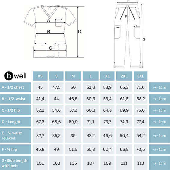 Медицински комплект BELLA е стилен дамски комплект, изработен от лека и дишаща материя (94% полиестер, 6% еластан), осигуряващ комфорт и свобода на движение през целия работен ден. Туниката е с къс ръкав, остро деколте, странични цепки и практични джобове. Панталонът има широка еластична талия, връзка за пристягане и множество джобове. Подходящ за лекари, медицински сестри, фармацевти, зъболекари, ветеринари и служители в козметични центрове. Комбинацията от удобство и модерна визия прави BELLA идеален избор за медицински персонал.