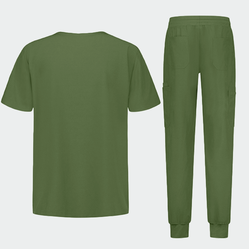 Мъжки медицински комплект MATTEO – туника и панталон тип джогър. Изработен от висококачествена материя (94% полиестер / 6% еластан, 170 г/м²), комплектът е лек, удобен и лесен за поддръжка. Туниката е с класически дизайн и три джоба. Панталонът има модерен джогър силует, широк ластик, връзки, множество джобове и джоб с цип. Подходящ за болници, лаборатории, аптеки, дентални и ветеринарни клиники. Може да се носи върху тениска или термобельо. Наличен в различни цветове.