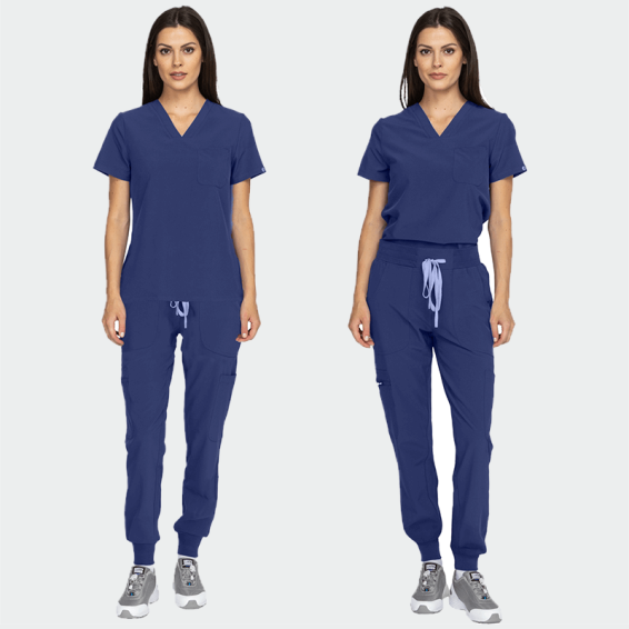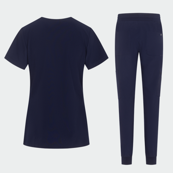 Дамски медицински комплект NAOMI – стилен и удобен избор за медицински специалисти. Състои се от туника с остро деколте, къс ръкав, странични цепки и три джоба, и панталон тип "джогър" с ластик, връзка и функционални джобове. Изработен от висококачествена, дишаща материя (94% полиестер / 6% еластан), осигурява комфорт и свобода на движение. Подходящ за лекари, медицински сестри, зъболекари, фармацевти и персонал в козметични центрове. Идеален за ежедневна употреба. Медицински комплект за жени, съчетаващ стил, практичност и качество.