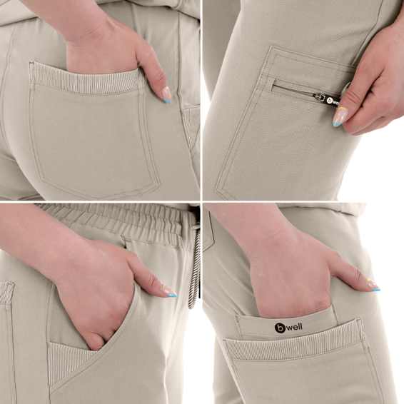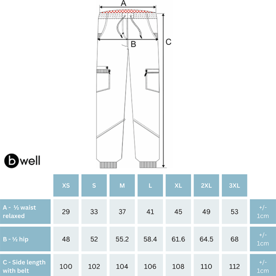 Дамски медицински панталон RICCI от B-well комбинира стил и комфорт. Изработен от дишаща материя – 72% полиестер, 21% вискоза и 7% еластан (200 г/м²), осигурява свобода на движение и предотвратява изпотяване. Подходящ за лекари, медицински сестри, зъболекари и персонал в клиники или естетични студиа. Моделът е с ластик и връзки в талията, ластик на крачолите и седем функционални джоба, включително един с цип. Спортно-елегантната кройка го прави идеален както за работа, така и за свободното време.