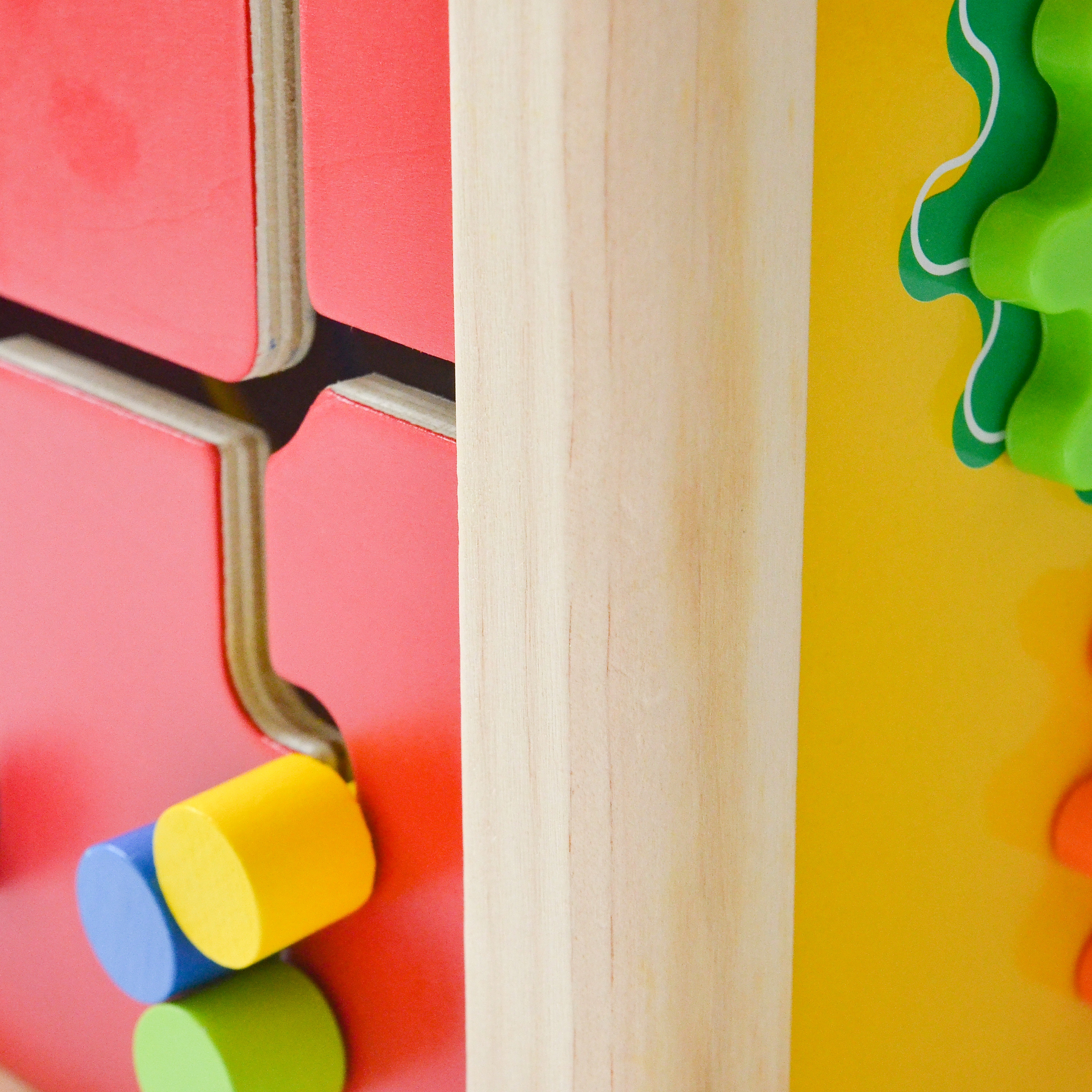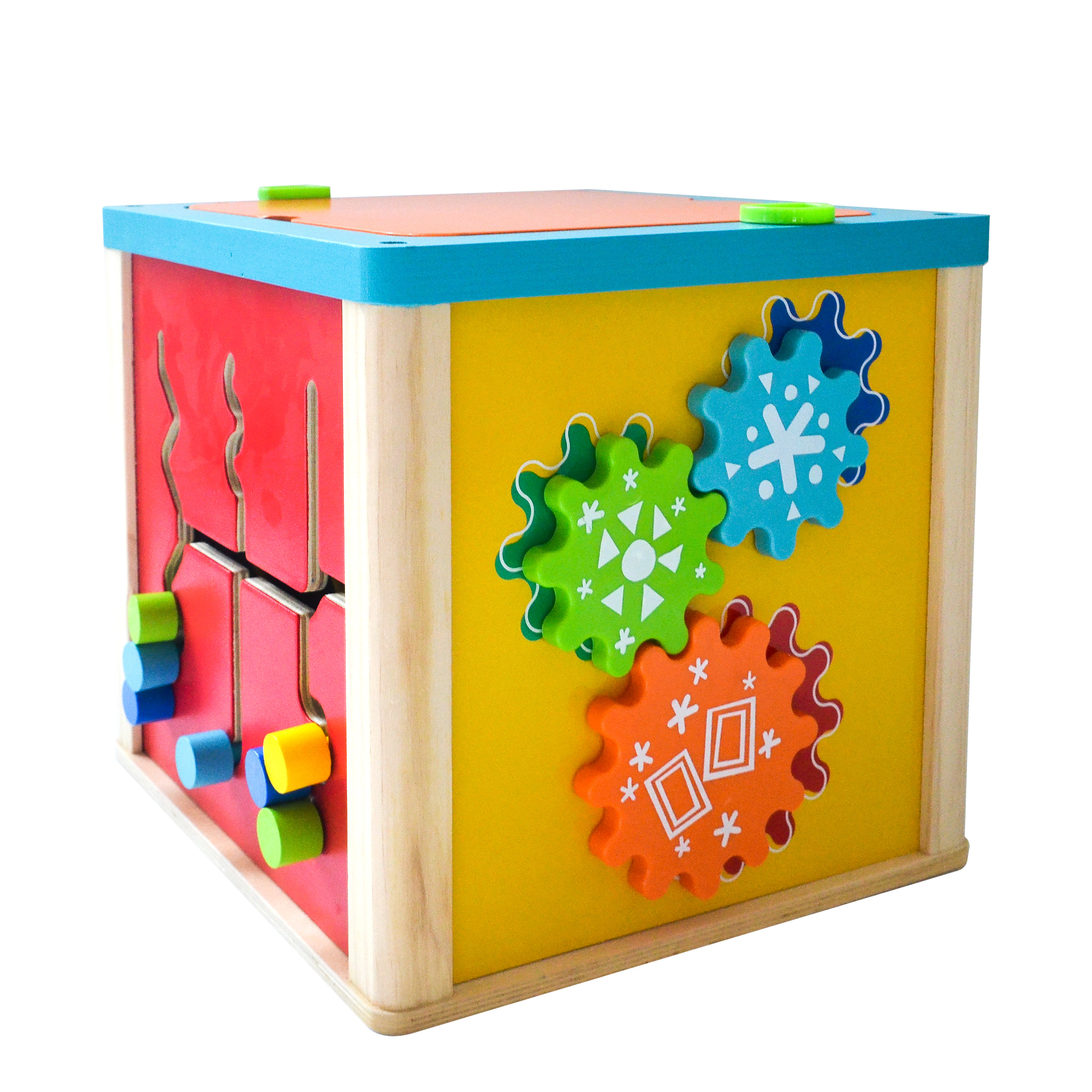 Многофункционалната дървена играчка-куб е идеален избор за ранно развитие. Тя включва поставяне на геометрични фигури, игра със зъбни колелета, лабиринт с топчета, часовник и пътечки за проследяване. Този дървен образователен куб стимулира фината моторика, логическото мислене, координацията, концентрацията и вниманието. Изработен от безопасни материали и подходящ за деца над 18 месеца. Размери: 27×27×46 см. Перфектна занимателна и обучителна играчка за малчугани.