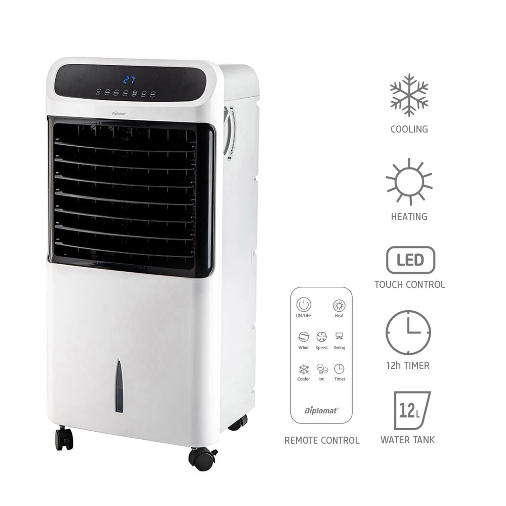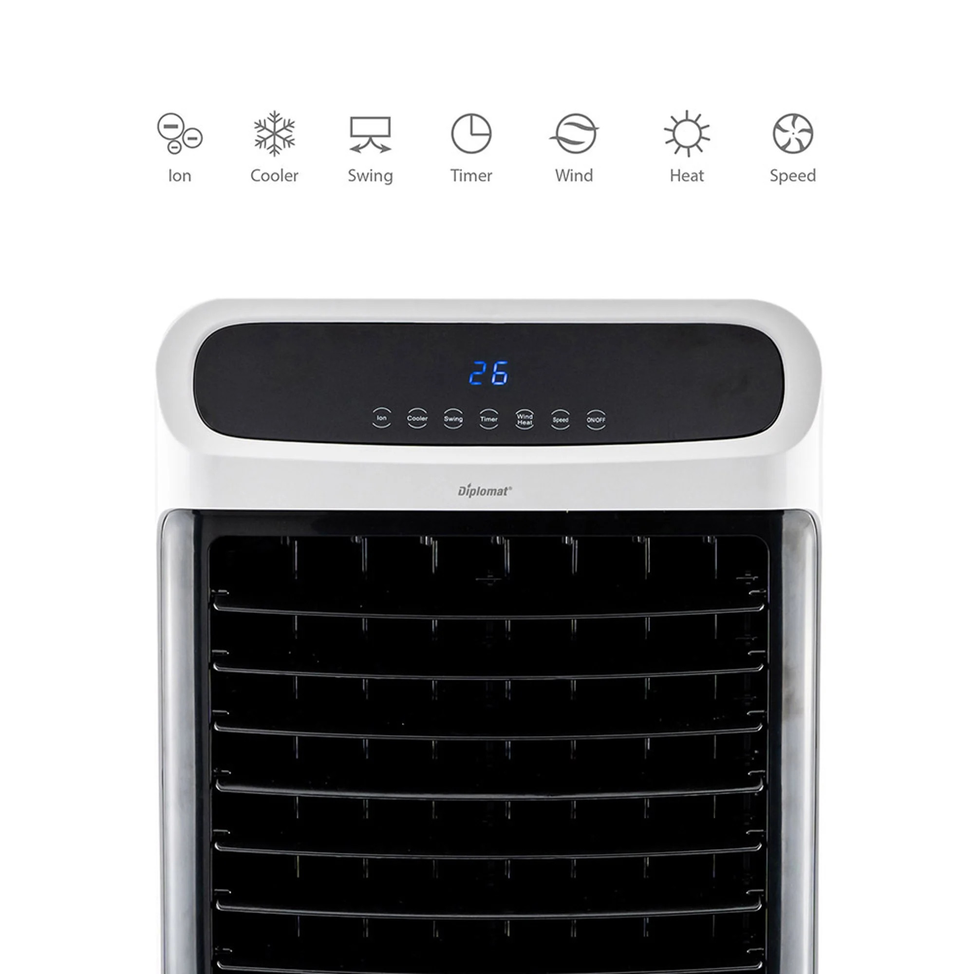 Мобилен охладител и отоплител Diplomat DX-80CHRC 5в1 – универсално решение за климатизация на дома и офиса. Охлажда с 3 степени и отоплява с 2 режима (1000/2000W). Вграден овлажнител, йонизатор и пречистване на въздуха осигуряват свеж и чист въздух. Функция „Осцилация“ с широк ъгъл на завъртане, 12-часов таймер и LED панел с дистанционно управление за удобство. Обем на резервоара 12 л, максимален дебит 450 м³/ч, шум 65 dB. Компактен и мобилен с колела, водо- и прахоустойчив (IP20). Размери: 380х350х810 мм, захранване 220-240V, 50-60Hz.