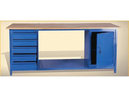 Монтажно бюро с чекмеджета Profis 2000 х 700 х 855 мм модул с вратичка и полица, и модул с чекмеджета е стабилно, удобно и функционално. Изработено е със здрава и надеждна конструкция с рамка от профилни тръби, долен метален плот и горен плот от шперплат 30 мм. Има възможност за облицоване на плота със стоманена ламарина.