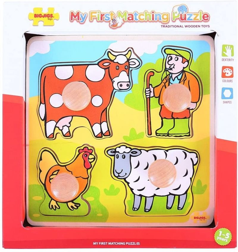Детският пъзел на Bigjigs „Ферма“ запознава малките с кравата, кокошката, овцата и фермера. Всяка дървена част има удобна дръжка за малки ръчички и под нея свързващо изображение за лесно подреждане. Пъзелът развива фината моторика, логическото мислене и координацията, като стимулира игровото учене. Изработен е от безопасно дърво и боядисан с нетоксични бои, подходящ за деца от първата година.