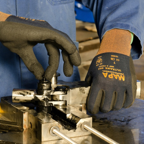 Работните ръкавици ULTRANE 500 MAPA осигуряват висока защита и комфорт при работа в мазна или абразивна среда. Изработени са от дишащ текстил с нитрилно покритие Grip&Proof, което гарантира отлично сцепление, износоустойчивост и топлоустойчивост. Ръкавиците намаляват мускулното напрежение и повишават продуктивността. Подходящи са за работа с масла и механични натоварвания. С петпръстен дизайн за прецизен захват.