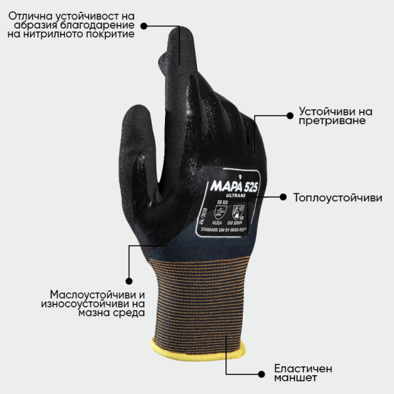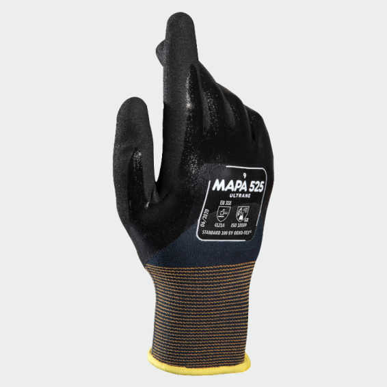 Работните ръкавици ULTRANE 525 MAPA предлагат висока защита, комфорт и издръжливост при работа в мазна или абразивна среда. Изработени са от безшевен текстил с вентилиран гръб и нитрилно покритие Grip&Proof, което осигурява отлично сцепление, устойчивост на масла и износване. Ръкавиците намаляват мускулното напрежение и подобряват продуктивността, като гарантират прецизен захват благодарение на петпръстния си дизайн.