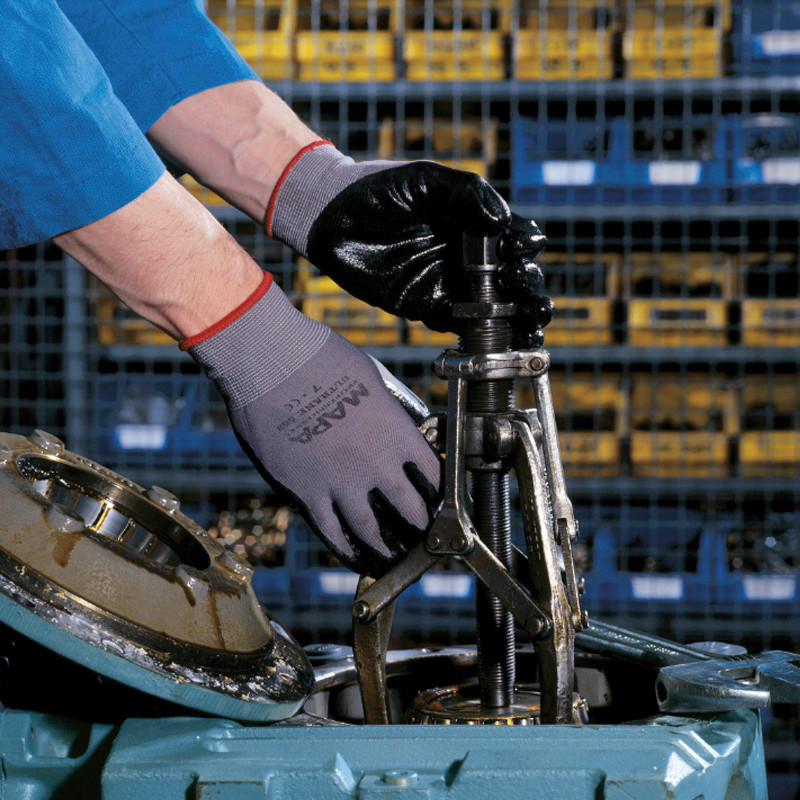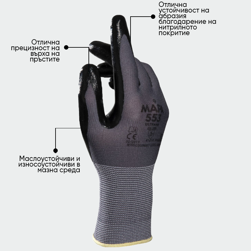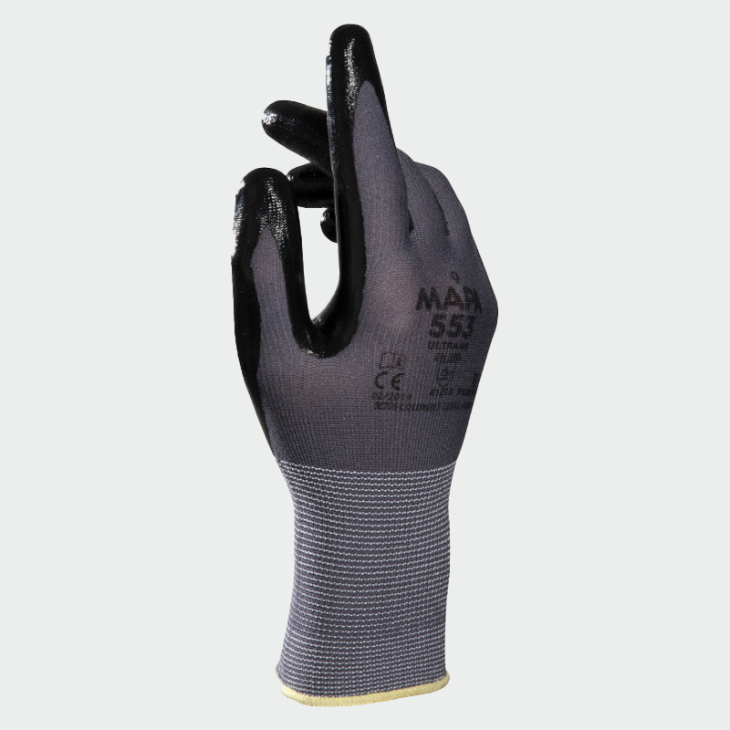 Работните ръкавици ULTRANE 553 MAPA осигуряват комфорт и надеждна защита при работа в мазна или абразивна среда. Безшевният текстилен дизайн с вентилиран гръб и нитрилно покритие гарантира отлична устойчивост на износване, масла и замърсявания. Ръкавиците предлагат прецизен захват и отлична чувствителност на пръстите, подходящи за дълготрайна употреба.